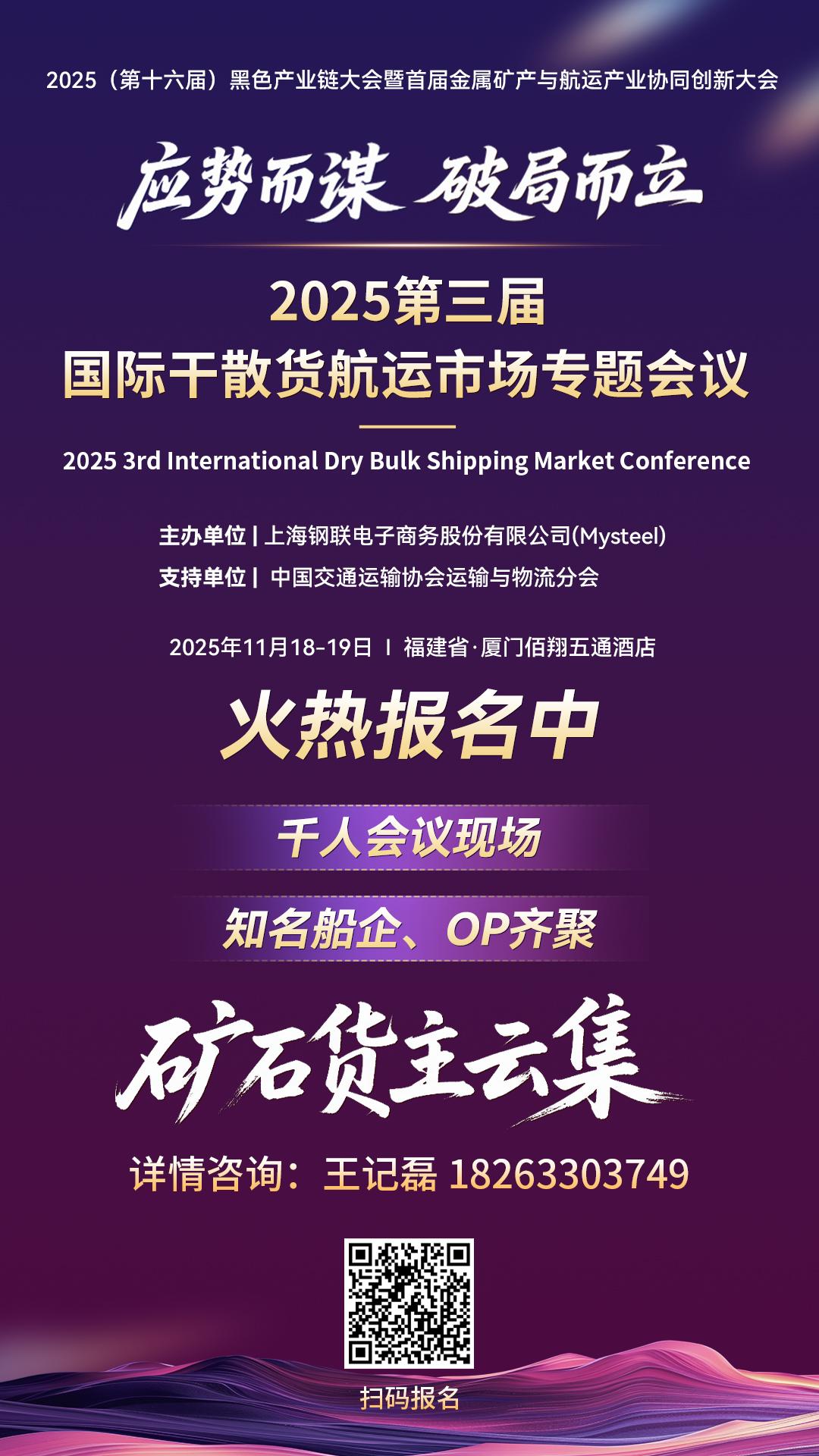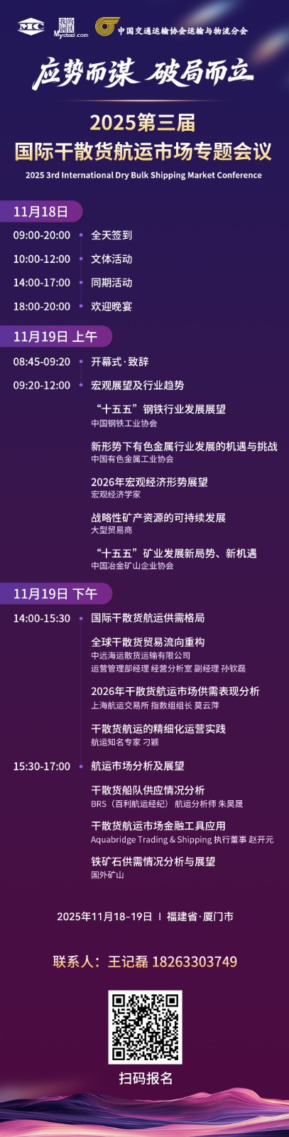 为深入探讨全球干散货航运市场面临的新机遇与新挑战,推动产业链上下游的协同合作与创新发展,“2025第三届国际干散货航运市场专题会议” 将于2025年11月19日在中国著名港口城市厦门隆重举行。中国交通运输协会运输与物流分会将作为支持单位,帮助与会者准确把握市场脉搏,洞察前沿趋势,寻找合作商机。